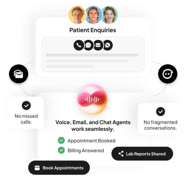 Patient enquiries often begin with urgency, uncertainty, or the need for reassurance. The Voice Agent responds instantly, manages inbound calls, understands intent, and resolves common questions without creating queues or repeat callbacks.