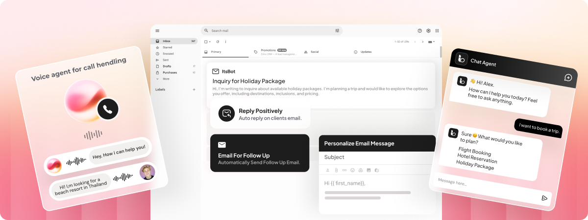 Travel buyers do not book instantly. They compare fares, check dates, ask questions, and wait for reassurance. ItsBot ensures every enquiry is answered, every option is explained, and every interested traveler is followed up until a booking is confirmed, using one AI-powered omniagent across chat, email, and voice.