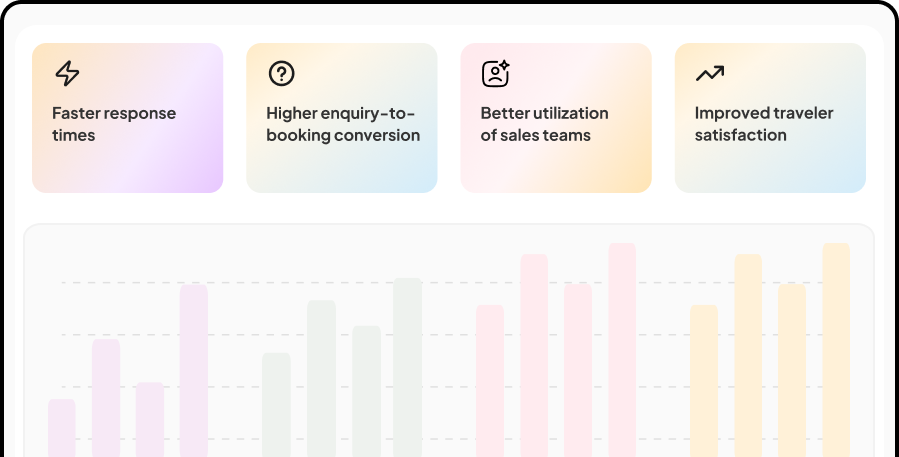 Handle peak-season traffic without delays. Convert more enquiries into bookings. Reduce manual follow-ups and agent burnout. Travel businesses using ItsBot typically see: